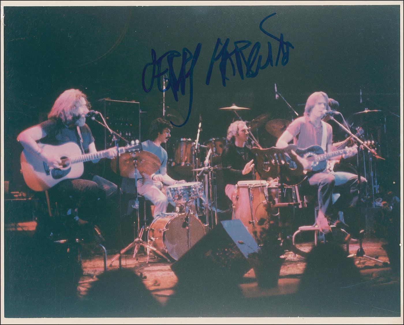 Color glossy 10 x 8 photo of the Grateful Dead performing an acoustic number, signed in-person in blue felt tip. In fine condition, with some scattered light surface marks, small punch hole to right edge, and a bit of trivial edge loss to upper left. Originally obtained by in-person specialist Mike Wehrmann.
