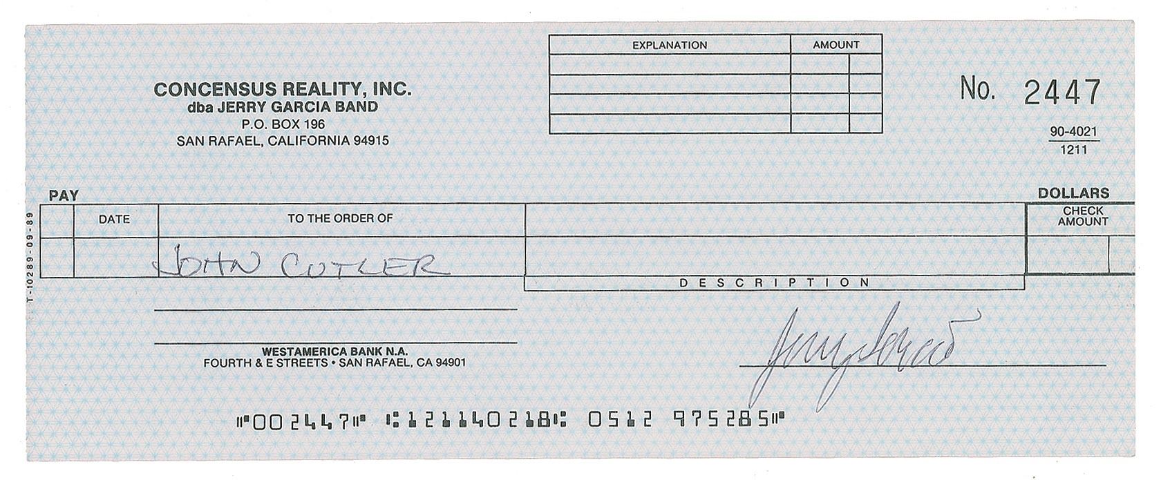 Unused Concensus Reality, Inc. (Jerry Garcia Band) business check, 8.25 x 3.25, filled out and signed by Jerry Garcia, payable to Grateful Dead engineer John Cutler. In fine condition. Accompanied by a full letter of authenticity from REAL.