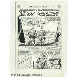 <B>Jerry Grandenetti (attributed) - Our Army at War Complete Unpublished 6-page Story "Last Stand" Original Art (DC, circa 1956).</B></I> Take ten, DC war fans, and marvel at this discovery of a finished yet unpublished prize battle tale. No story with the title "Last Stand" could be found in Chris Pedrin's comprehensive index of DC war yarns, the <B>Big Five</B></I>. That and the lack of Comic Code Authority stamps on the back of the art leads us to conclude this is an unpublished story. History repeats itself as 1940 allied troops battle to the death to defeat the invaders at Thermopylae Pass, just as Leonidas and his Spartans had done 2500 years ago. The image area of each page measures 13" x 18", and the art is in Excellent condition. Here's your chance to read a new yet vintage DC battle classic!