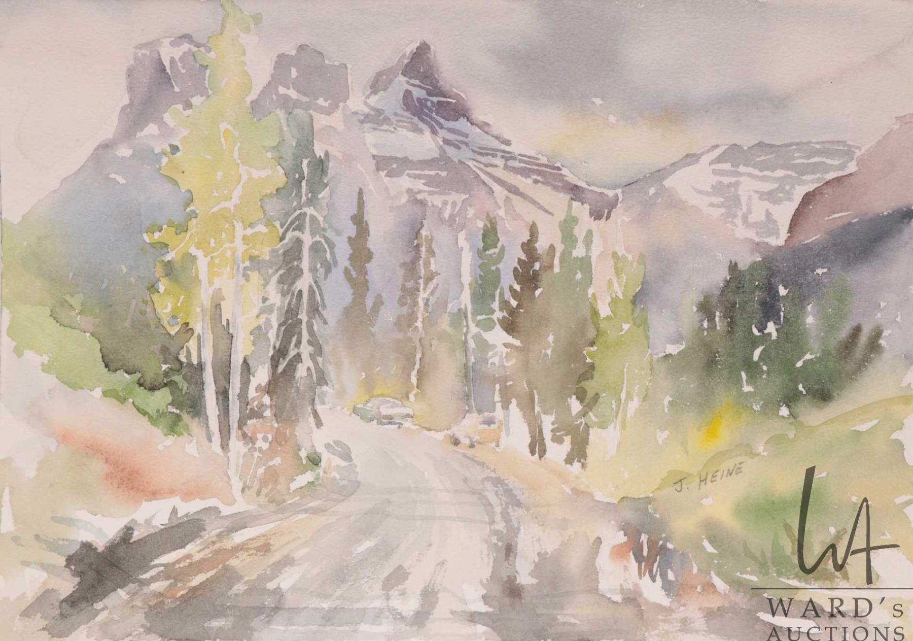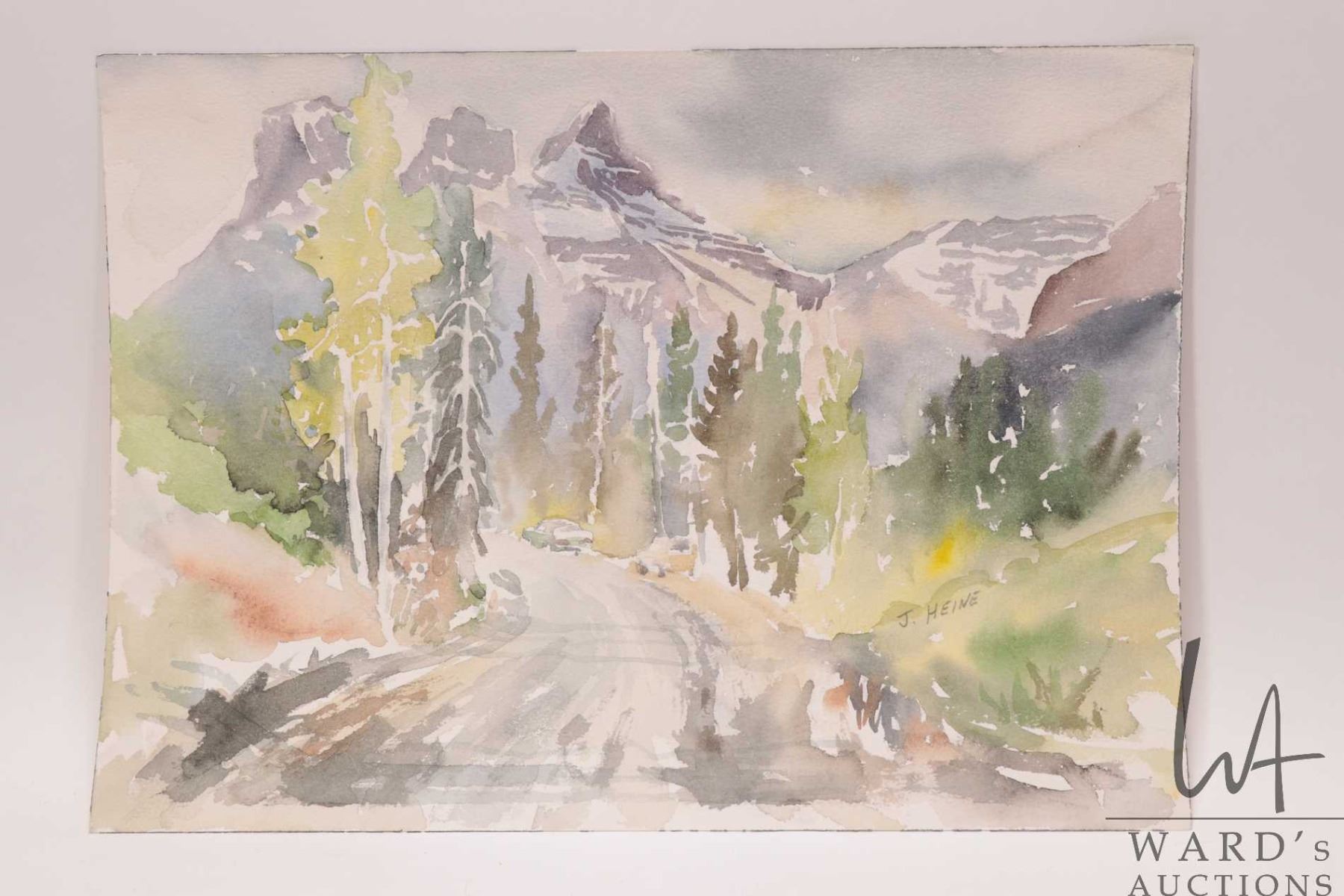 Jerry Heine unframed original watercolour painting of a mountain and road scene, 10" X 14"