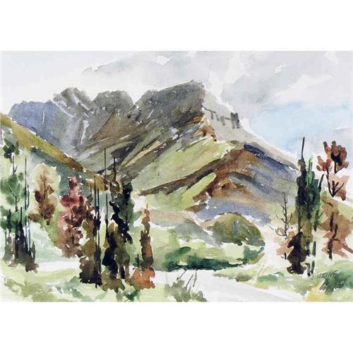 Canadian ASA [b. 1937] MOUNTAIN AND RIVER LANDSCAPE watercolour on paper 10 x 14 in. (25.4 x 35.6 cm) signed