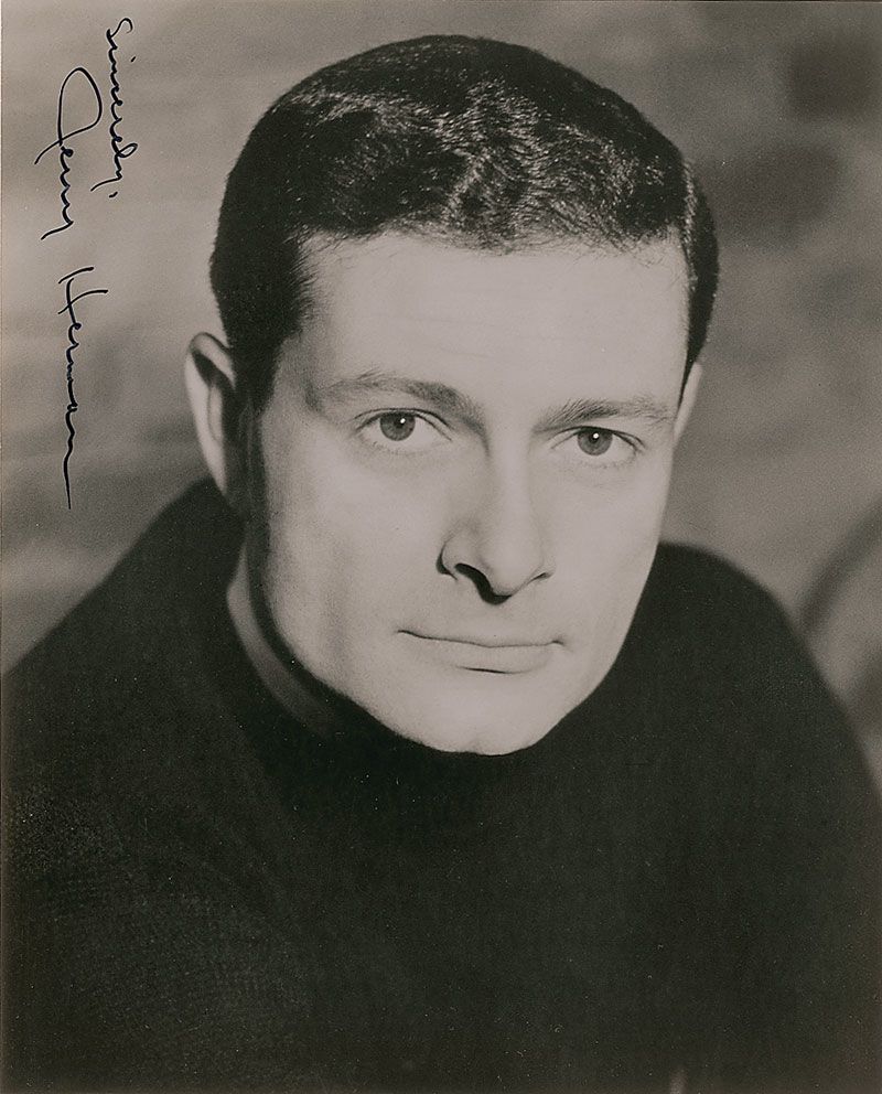 Glossy 8 x 10 head-and-shoulders photo, signed vertically in black felt tip, “Sincerely, Jerry Herman.” In fine condition, with scattered surface bends.