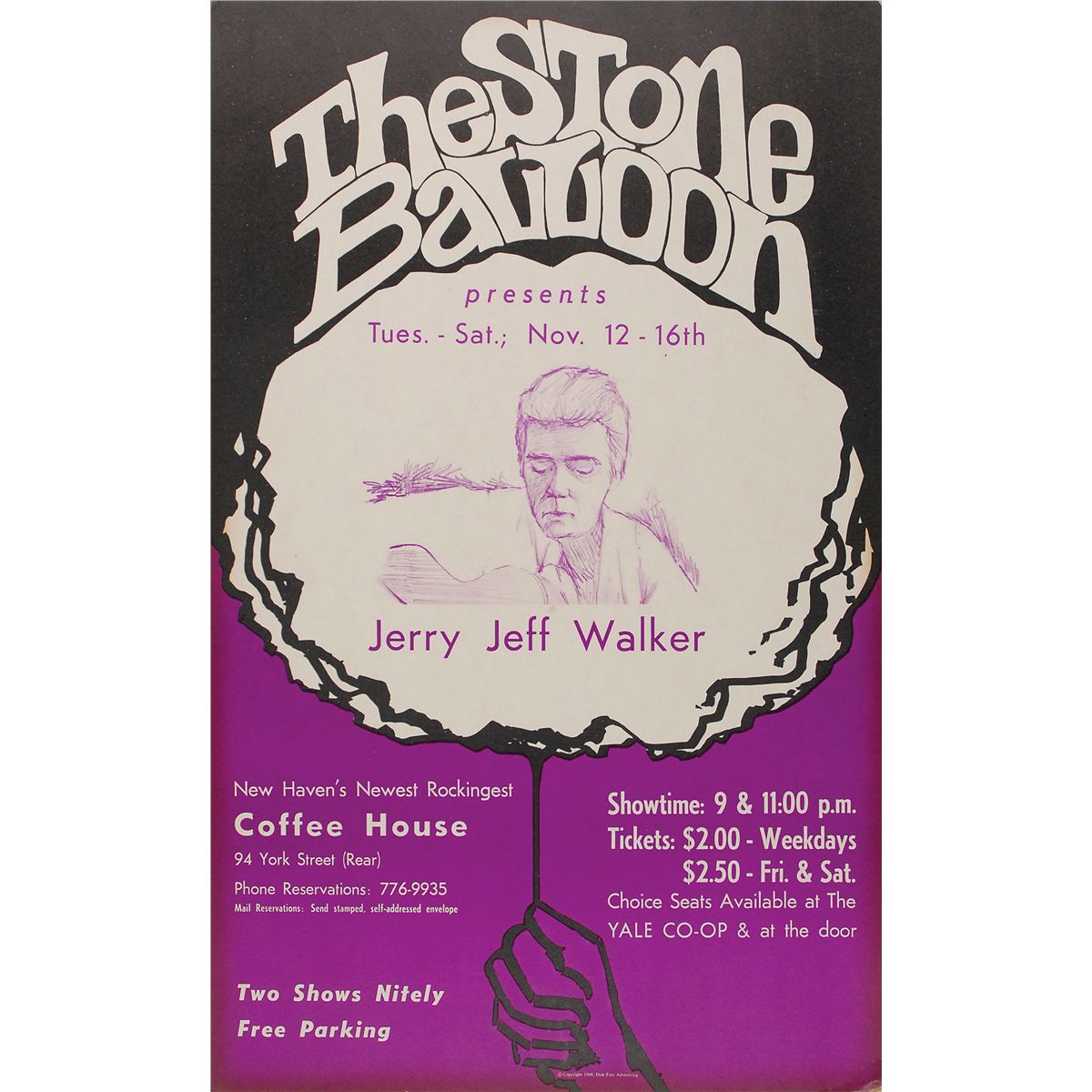 Original color 13.5 x 21.5 poster for Walker’s November 12-16, 1968, shows at the New Haven Coffee House, presented by The Stone Balloon. In fine condition, with a few light corner and edge creases.