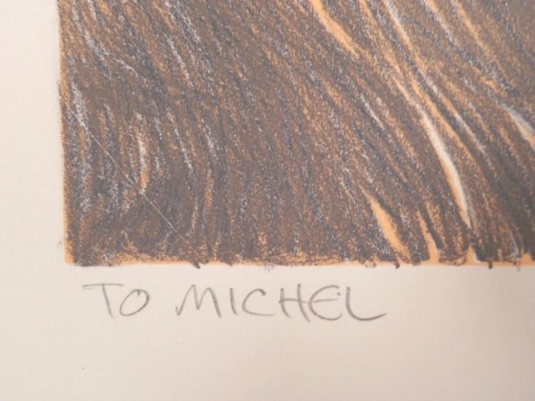 Unusual perspectives and body movements are the focus of this interesting art print. Artist: Jerry Kearns Signature: "J. Kearns" in pencil, lower right Medium: Lithograph on rag paper Edition: Unnumbered, dedicated artist proof, marked "To Michel" in pencil, lower left Sheet size: 26 1/2 x 21 inches Condition: Excellent; marks at the lower right margin corner Biography:Jerry Kearns (1943- ) was born in West Virginia and grew up in California, graduating with an MFA from UC Santa Barbara. In 1976 he moved to New York and became a cultural activist and artist with the Artist Meeting for Cultural Change (AMCC) and The Red Herring Collective. In the late 70s, Kearns worked as a street photographer with civil rights groups. His painting career really began in 1985 during a solo exhibition in New York. Since that time, he has had numerous exhibitions, and today his prints and paintings are found in many museum and public collections, including The Museum of Modern Art in New York, The Whitney Museum of Modern Art, The San Francisco Museum of Modern Art, The Nationale Galerie, Berlin, The IVAM Centre, Valencia, Spain, and The Western Gallery of Art, Perth, Australia. 2 We are pleased to present from an estate a group of dedicated artist proofs.