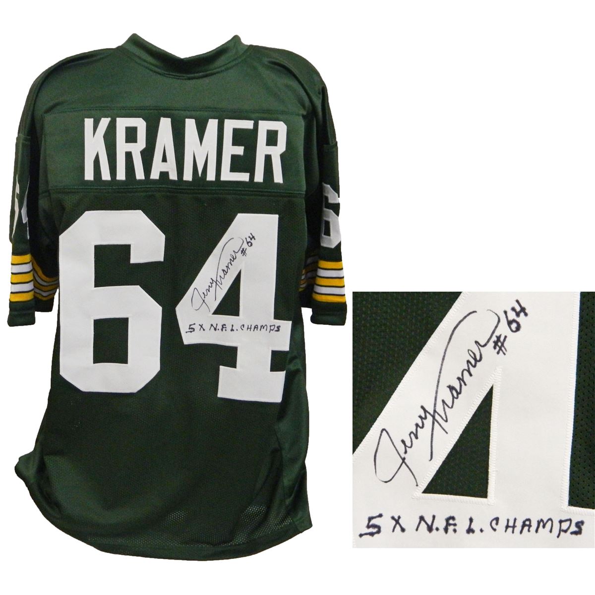 Jerry Kramer signed green throwback custom football jersey with '5x NFL Champs' inscription. Item comes with a Schwartz Sports Memorabilia tamper-proof numbered hologram and Certificate of Authenticity which can be verified online.