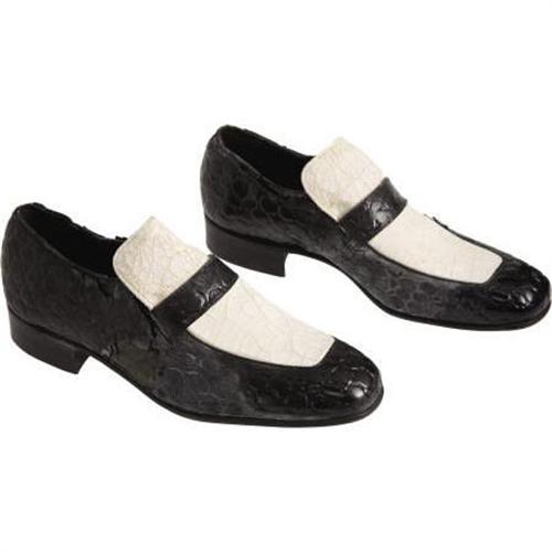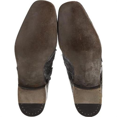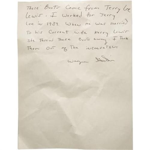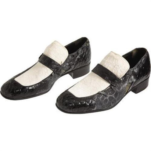 <B>Jerry Lee Lewis Owned and Worn Shoes.</B></I> Jerry Lee Lewis certainly used his feet more than most any other Rockabilly cat, even playing some notes on the piano with the heel of his shoe. These the size 9 1/2 Frank Brothers white-top loafers have seen their fair share of stomping, jumping and standing on the piano; the faux croc patent-leather has deteriorated on the sides, the soles are moderately scuffed and the white tops have substantial cracks, but the shoes are in overall Good condition and come with a letter of provenance from Lewis' former employee, confirming that they indeed belonged to Rock and Roll's original wild man.<BR><BR><b>Shipping:</b> Clothing, Costumes & Jerseys (<a target="_blank" href="http://www.heritageauctions.com/common/shipping.php">view shipping information</a>)