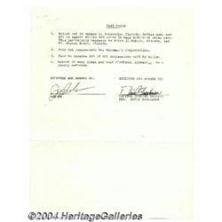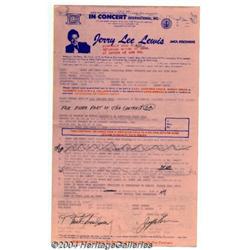<B>Jerry Lee Lewis Signed Performance Contract.</B></I> Jerry Lee Lewis signed this personalized, pink contract form in black pen at the bottom of page one. This document books Lewis for a performance in Pensacola, Florida on October 25, 1985. Interestingly, it is stipulated in the contract that Jerry Lee shall be paid the balance due "in cash prior to his performance." This rider/contract also quite effectively spells out each and every detail of his demands and requirements, and the back of the contract is full of still more stipulations, plus a stage plot for the local crew to use as a guide in setting up for his performance. Jerry Lee Lewis may be known as "The Wild Man of Rock and Roll", but this contract is airtight and brilliantly conceived and written! A wonderful and rare piece, plus it comes with the yellow carbon of the pink original and a letter from the booking agent seeking permission to advertise Lewis' performance. <I>Accompanied by COA from PSA/DNA. </B></I> <BR><BR><B>Important notice:</B> Heritage usually auctions material at the rate of 200-250 lots per hour. On some occasions eBay Live bid software or the Internet may not be able to keep up with the pace of the auction. We recommend placing a realistic absentee bid now as insurance to avoid disappointment. Occasionally the auctioneer may eliminate or reject an eBay Live bid, and the auctioneer may also reopen a lot after the close of the eBay live bidding (usually because we missed an audience bid), and may reject your bid even if it shows you as the winning bidder. By bidding via eBay Live, you agree that Heritage may award the lot to another bidder at its sole discretion under the circumstances described above or any other reasonable circumstances. Since eBay bids are not shown to us until we open the lot on the floor, we treat those bids just like floor bids. In most cases the floor responds before the eBay bid is presented to us, due to Internet lag time, so for consistency we have made it a policy that floor bids are always considered first over tie eBay live bids. Also please note that all Heritage lots purchased through eBay Live carry a 24.5% Buyer's Premium. Please make sure you read the Terms and Conditions before you bid.