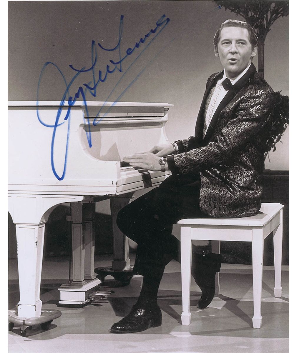 Laserprint 8 x 10 photo of Lewis seated at a piano signed in blue felt tip. In fine condition.