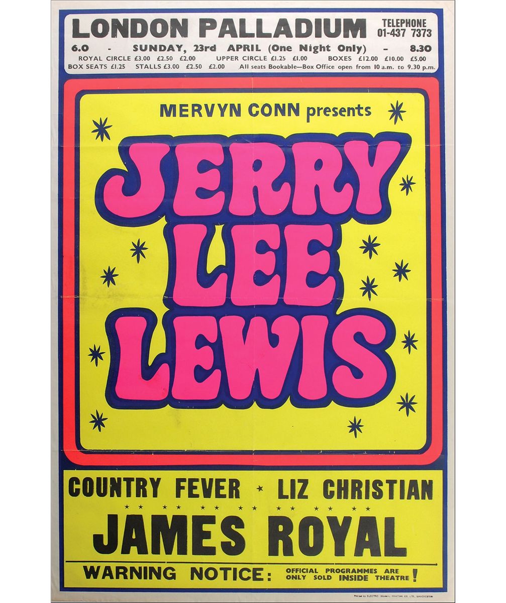 Colorful 20 x 30 poster for Lewis’s April 23 concert at the London Palladium, presented by Mervyn Conn, and also featuring Liz Christian. Previous intersecting storage folds, scattered edge creases and dings, and some light soiling, otherwise fine condition. Rolled.