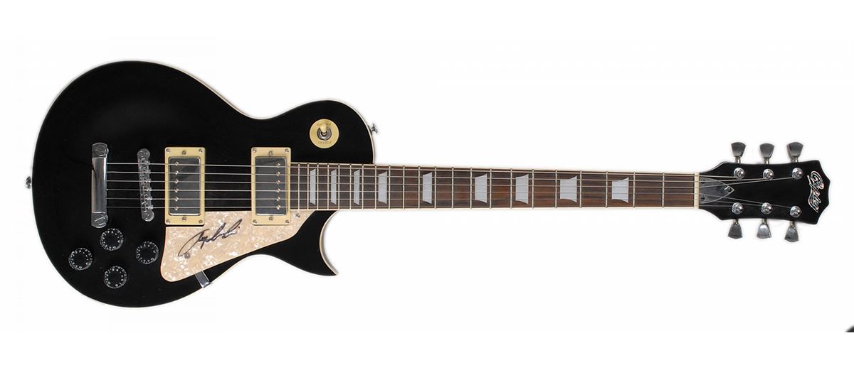 Black-bodied Copley ‘Les Paul’ style electric guitar, signed in black felt tip on the mother-of-pearl pickguard by Lewis. Accompanied by a photo taken at time of signing and a full letter of authenticity from PSA/DNA. In fine condition. Oversized.