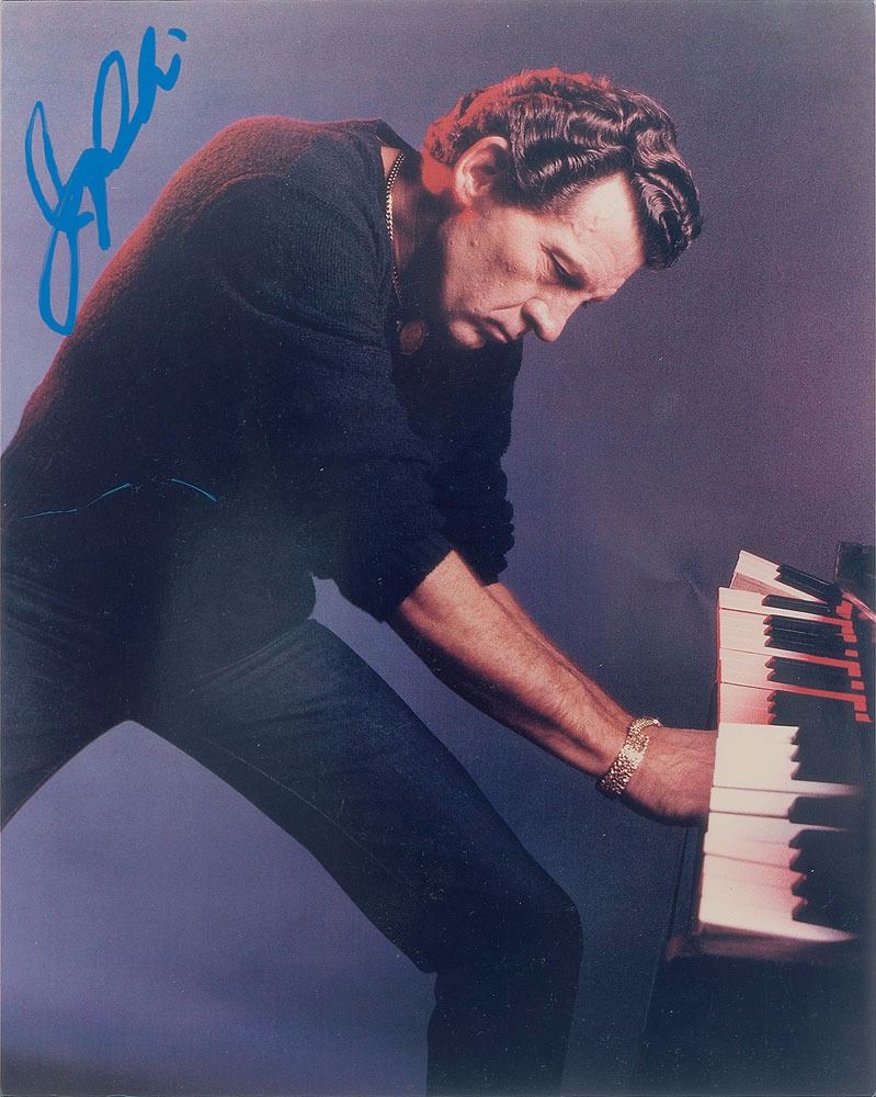 Color glossy 8 x 10 photo of Lewis playing the piano, signed in blue paint pen. In fine condition, with a stray ink mark to his sweater. Originally obtained by in-person specialist Mike Wehrmann.