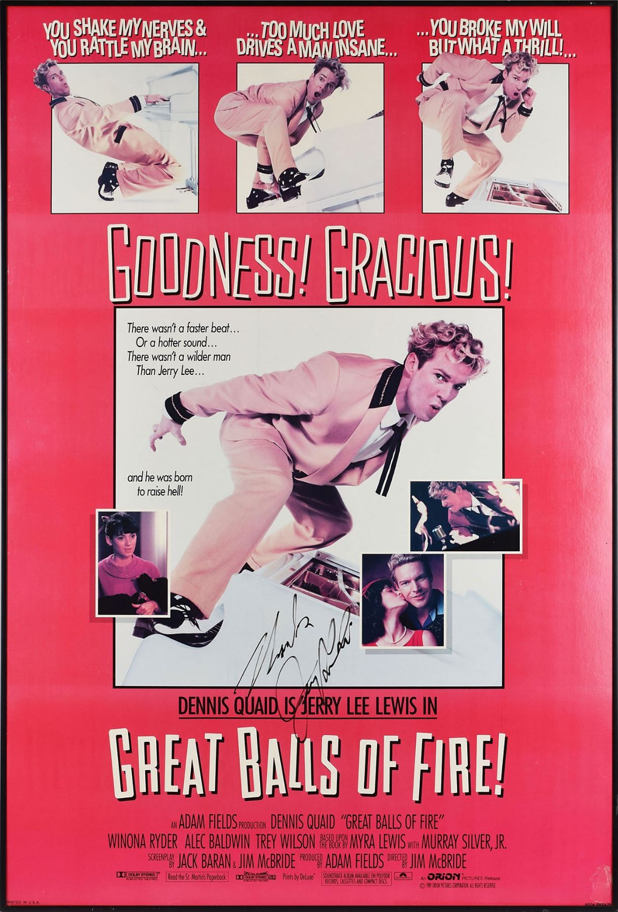Original color 26.75 x 40 one-sheet movie poster for the 1989 film Great Balls of Fire!, showing a large image of Dennis Quaid as the rockabilly pioneer with the text, "There wasn't a faster beat…Or a hotter sound…There wasn't a wilder man, Than Jerry Lee…and he was born to raise hell." Signed in black felt tip, "Thanks, Jerry Lee Lewis." Framed without glass and in fine condition.