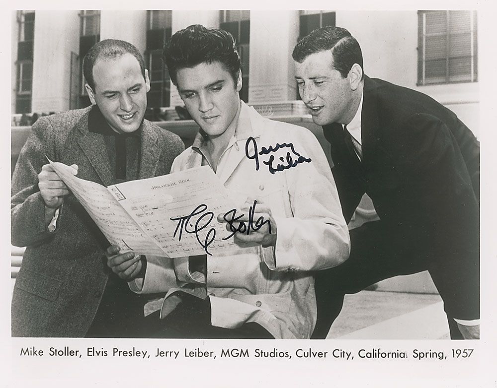 Glossy 10 x 8 photo of the song writing duo looking over a copy of ‘Jailhouse Rock’ with Elvis, signed in black felt tip by both Leiber and Stoller. In fine condition.