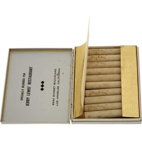 <B>Jerry Lewis Lighter and Cigarettes.</B></I> Includes a rare brass Storm Master lighter with a caricature of the comedian and his signature printed on the case, plus a box of 10 cork-tip cigarettes specially blended for Jerry Lewis' restaurant. Both are in Excellent condition.<BR><BR><b>Shipping:</b> Flat Material, Small (<a target="_blank" href="http://www.heritageauctions.com/common/shipping.php">view shipping information</a>)