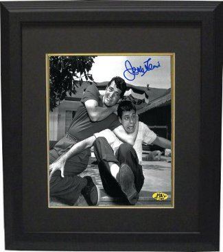 Jerry Lewis is an American comedian, actor, singer, film producer, screenwriter and film director. He is known for his slapstick humor in film, television, stage and radio. He was originally paired up with Dean Martin in 1946, forming the famed comedy team of Martin and Lewis.Dean sang some songs, and Jerry came out dressed as a busboy, dropping plates and more or less making a shambles of both Martin's performance and the club's sense of decorum. They did slapstick, reeled off old vaudeville jokes, and did whatever else popped into their heads at the moment. Jerry Lewis has hand signed this B&W 8x10 Photo in a Headlock with Dean Martin. MAB Hologram and Certificate of Authenticity from Athlon Sports. Custom Black Mat and Premium Black Frame as shown.