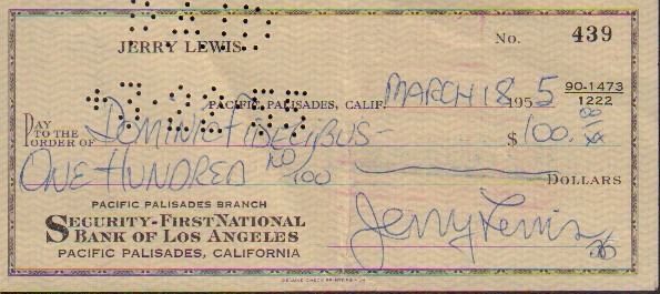 Original personal check written by Jerry Lewis on a Security First National Bank of Los Angeles. The check has been signed by Jerry and was drafted on March 18, 1955. All items come with a certificate of authenticity good for the life of the piece.