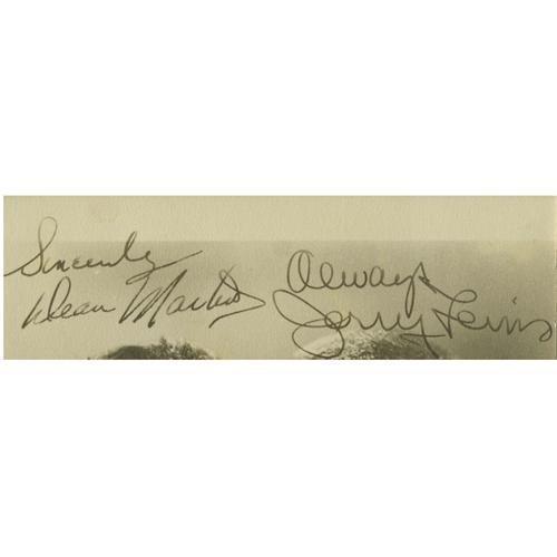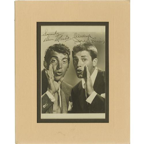 <B>Jerry Lewis and Dean Martin Signed Photo.</B></I> A b&w 5" x 7" photo inscribed and signed by the iconic comedy duo in black ink and matted to an overall size of 8" x 10". In Very Fine to Excellent condition with some very mild soiling. <I>Accompanied by a certificate of authenticity.</B></I><BR><BR><b>Shipping:</b> Flat Material, Small (<a target="_blank" href="http://www.heritageauctions.com/common/shipping.php">view shipping information</a>)