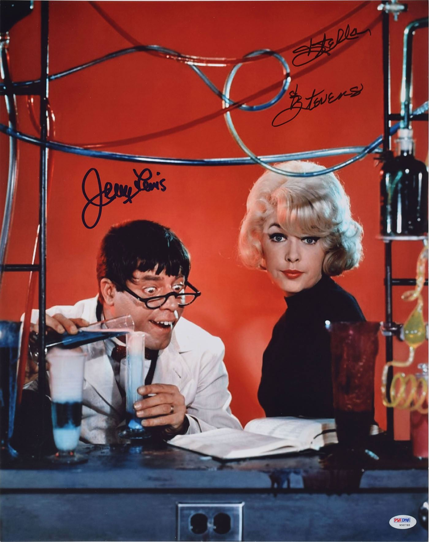 Color satin-finish 16 x 20 photo of Jerry Lewis as Professor Julius F. Kelp and Stella Stevens as Stella Purdy from the 1963 comedy The Nutty Professor, signed in blue felt tip by Lewis and in black felt tip by Stevens. In fine condition, with a PSA/DNA label affixed to lower right corner. Accompanied by a certificate of authenticity from PSA/DNA.