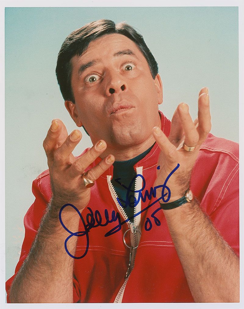 Color glossy 8 x 10 photo of Lewis mugging for the camera, signed in-person in blue felt tip, “Jerry Lewis 08.” Scattered creases, otherwise fine condition.