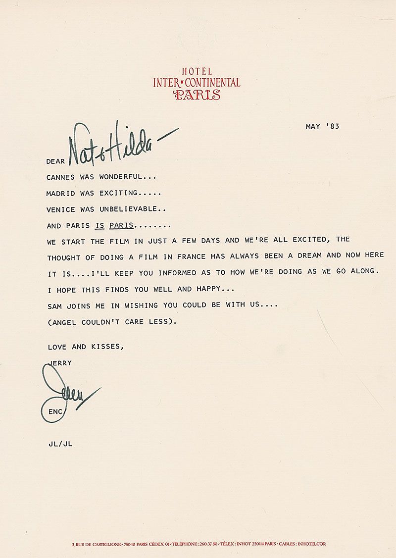 TLS signed “Jerry,” one page, 8.25 x 11.5, Hotel Inter-Continental Paris letterhead, May 1983. Letter to “Nat & Hilda.” In part: “Cannes was wonderful…Madrid was exciting…Venice was unbelievable…and Paris is Paris…We start the film in just a few days and we’re all excited, the thought of doing a film in France has always been a dream and now here it is.” In fine condition.