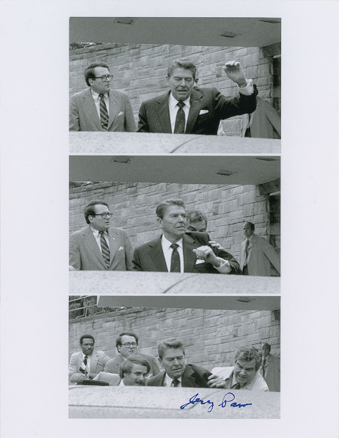 Uncommon 8.5 x 11 heavy paperstock photo of three images of Special Agent In Charge Jerry Parr pushing President Reagan into a limousine during the 1981 John Hinckley, Jr. assassination attempt, signed in blue felt tip by Parr. In very fine condition. Many believe that Parr's quick actions saved the life of the president.
