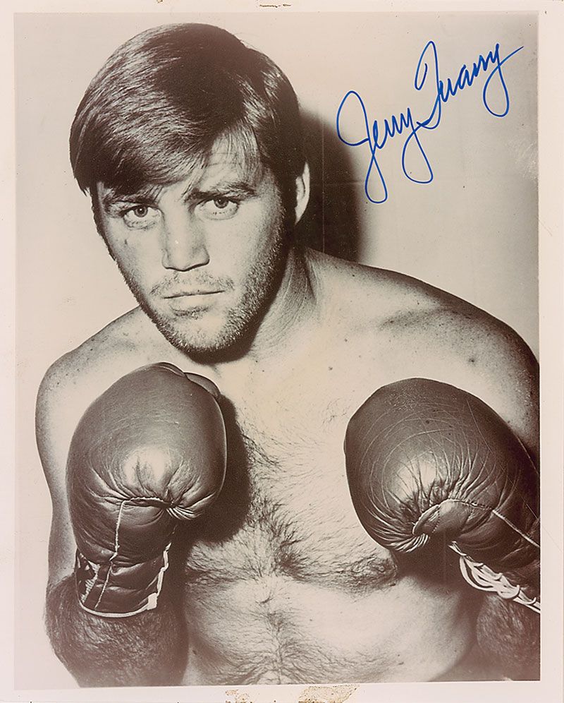 Nicknamed The Bellflower Bomber, Quarry was called by some the best heavyweight boxer to never win a world title. He would go on to suffer dementia pugilistica, atrophy of the brain from repeated blows to the head, eventually leading to an Alzheimer’s-like state that destroyed the last part of his life. Glossy 8 x 10 photo of Quarry in his prime, signed in blue felt tip. In fine condition, with some adhesive remnants along bottom border and a light bend to lower left corner.