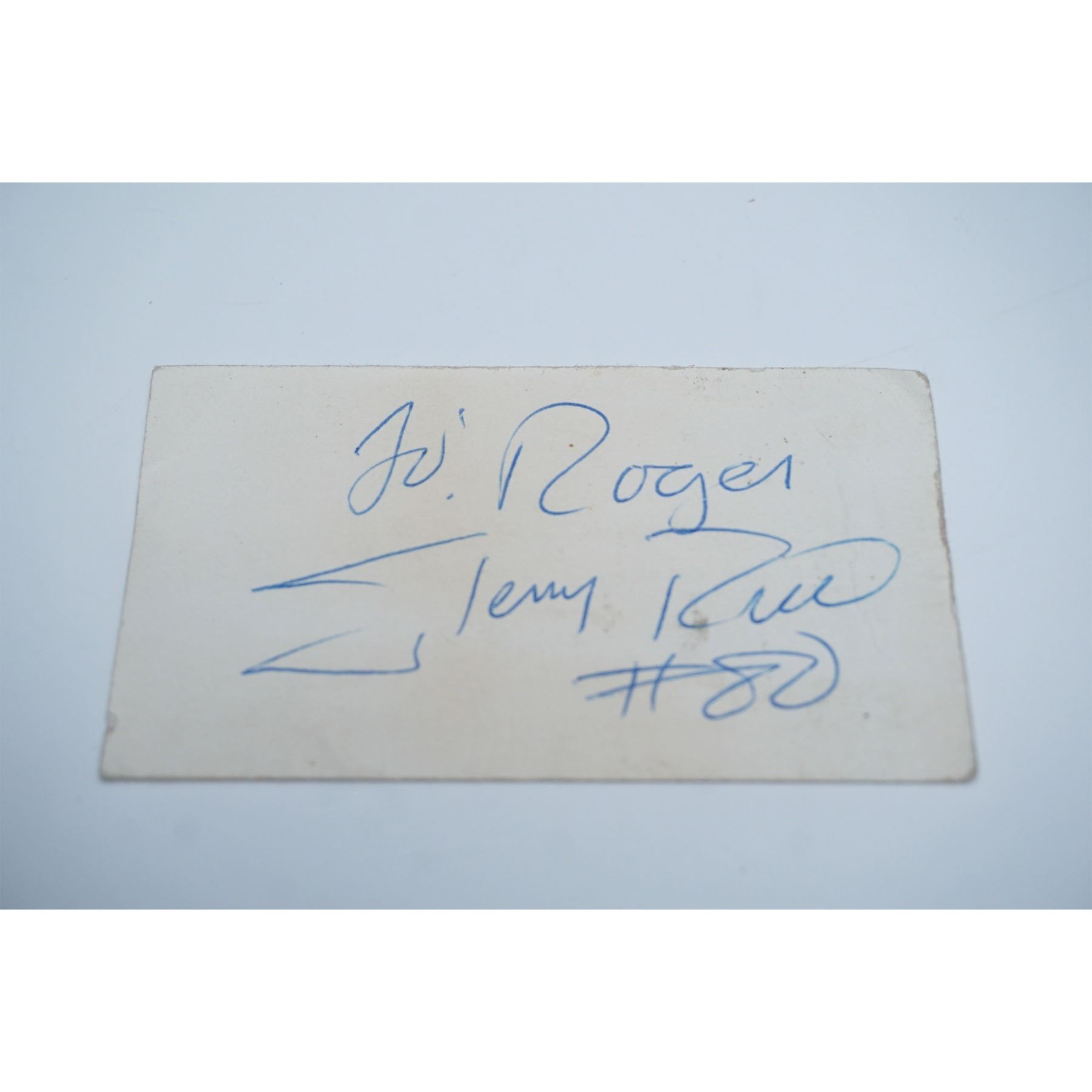 A signed business card featuring an inscription "To Roger" and an autograph from legendary NFL wide receiver Jerry Rice, with the number #80 written in blue ink. Widely regarded as one of the greatest football players of all time, Rice set multiple records during his career with the San Francisco 49ers, Oakland Raiders, and Seattle Seahawks. The signature is penned across a standard business card, adding a personal and collectible touch. The card exhibits light wear, consistent with age. A fantastic addition for sports memorabilia collectors and fans of NFL history.