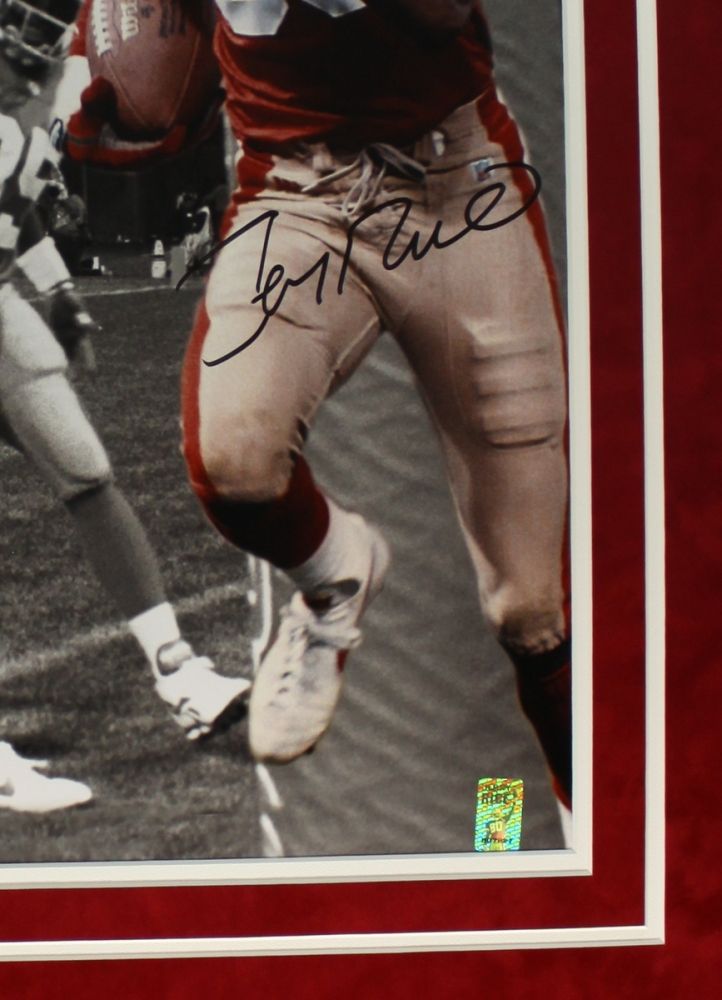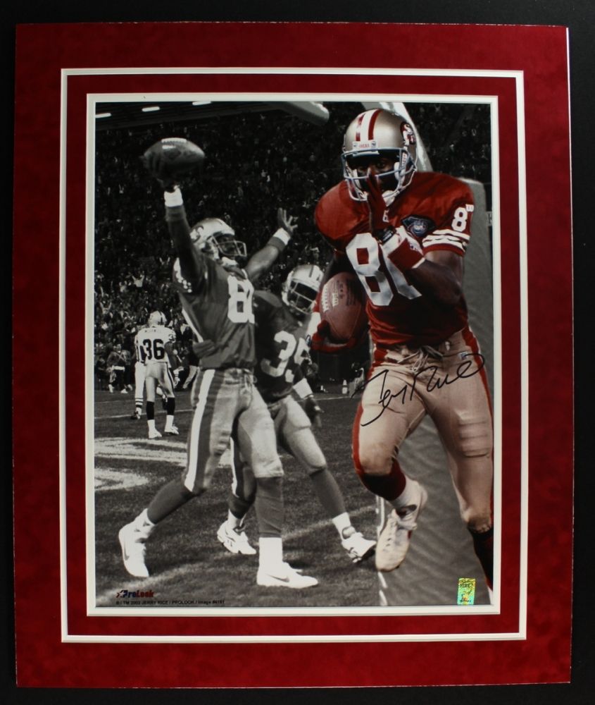 Piece measures 21x25" in size and has been hand-signed in black felt-tip pen by Jerry Rice (49ers HOF). Autograph includes an official Jerry Rice Hologram for authenticity purposes.