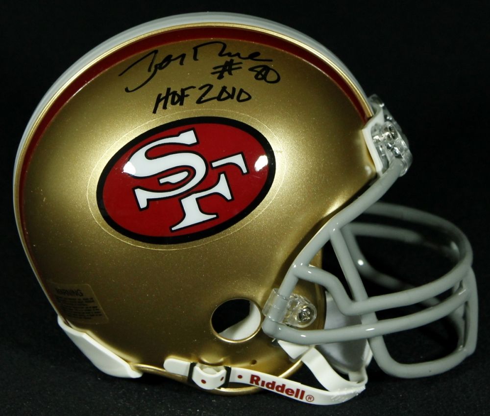 Riddell 49ers mini-helmet hand-signed in black felt-tip and inscribed "HOF 2010" by Jerry Rice (HOF). Autograph includes official Jerry Rice player hologram for authenticity purposes.