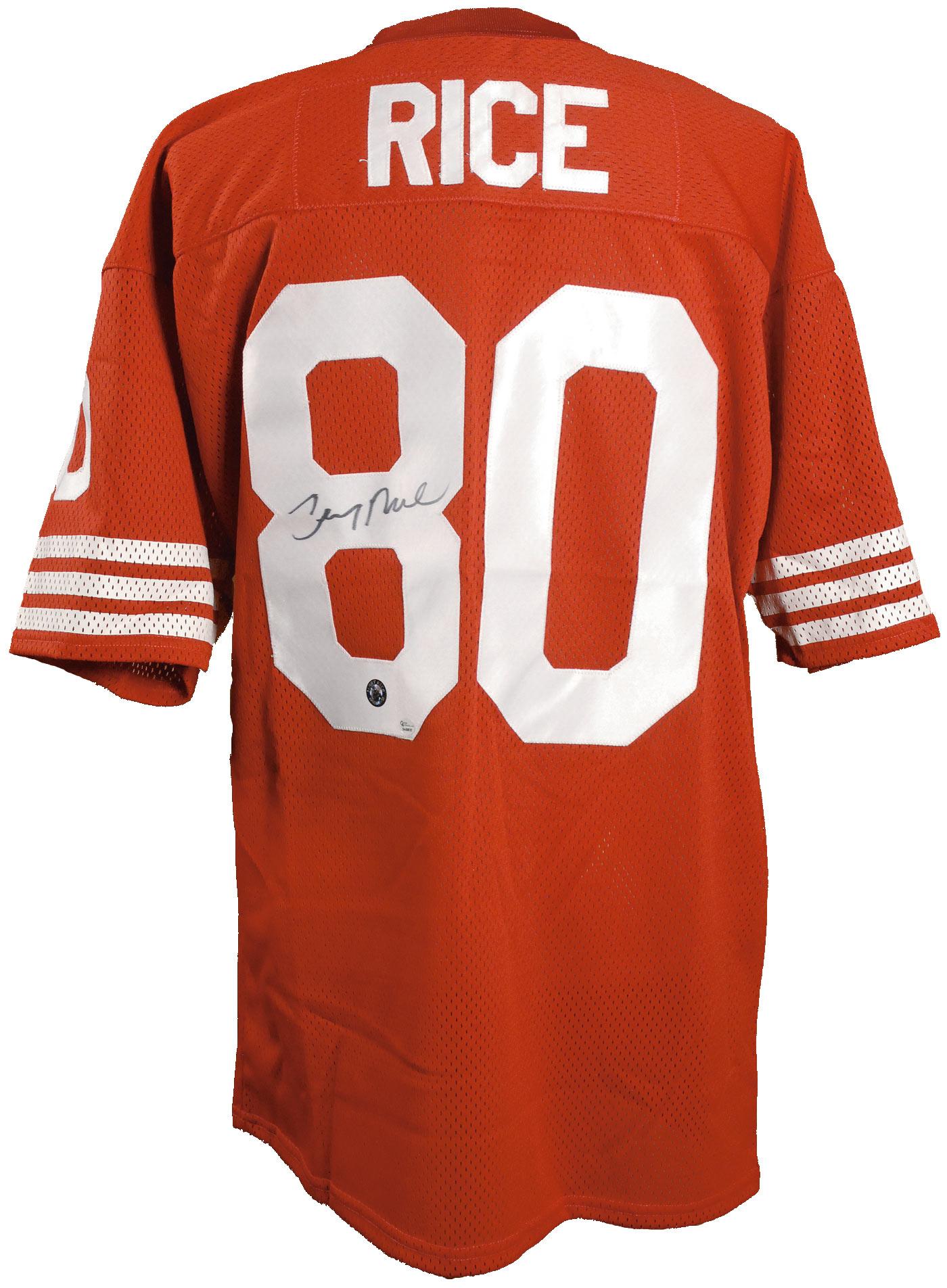 Replica San Francisco 49ers football jersey, with sewn-on letters and numbers, signed in black felt tip on the number on the back. In very fine condition.