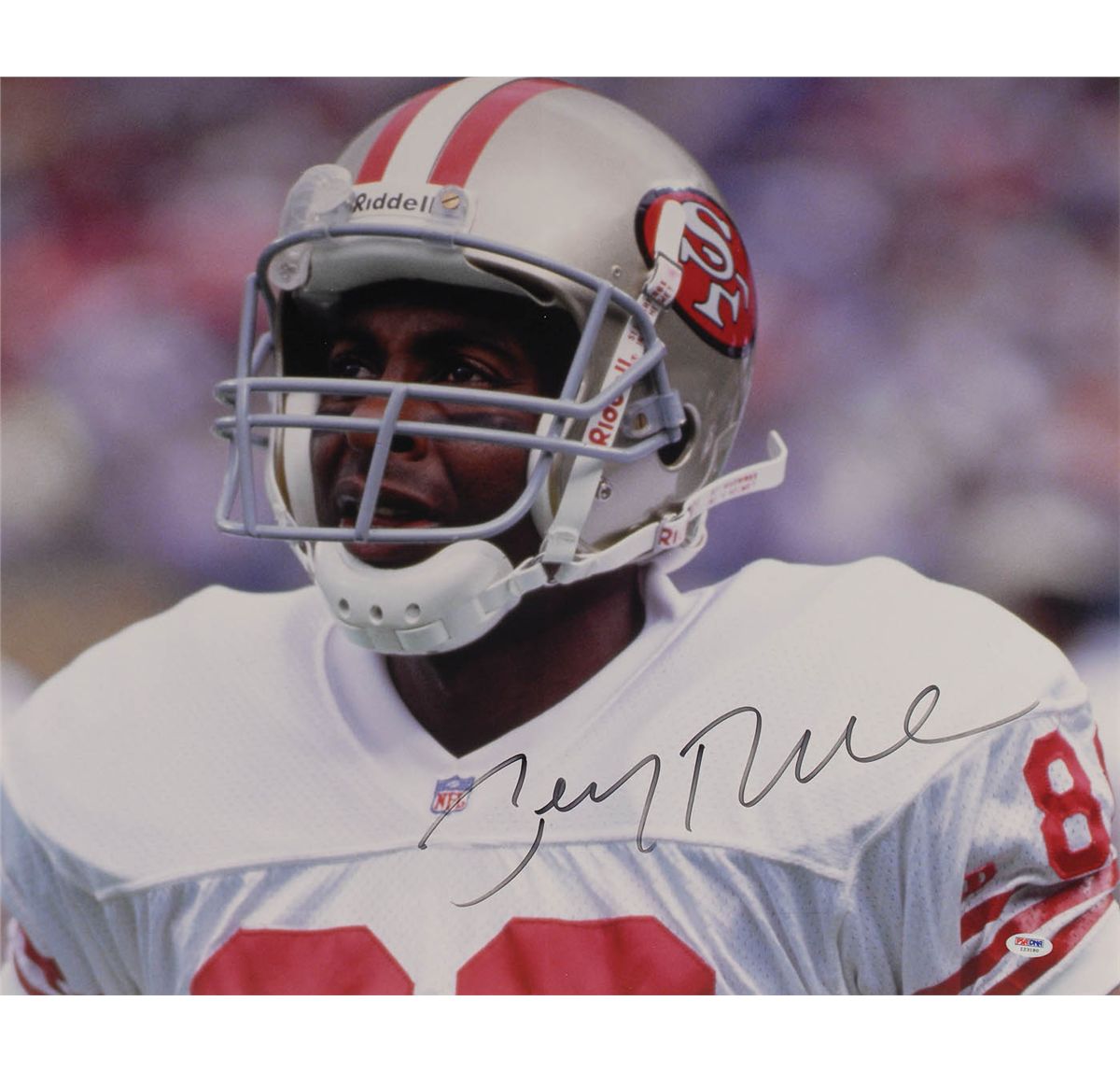 Color satin-finish 24 x 20 photo of Rice in his 49ers uniform, signed in black felt tip. In fine condition, with a PSA/DNA authentication label affixed to lower corner.