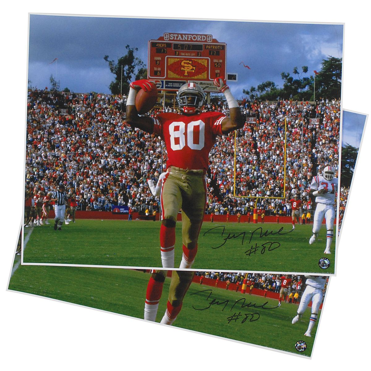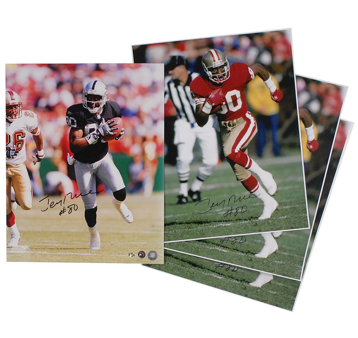 Six color photos, 16 x 20 and 20 x 16, of Rice on the field with the 49ers and Raiders, each signed in black felt tip. In fine condition.
