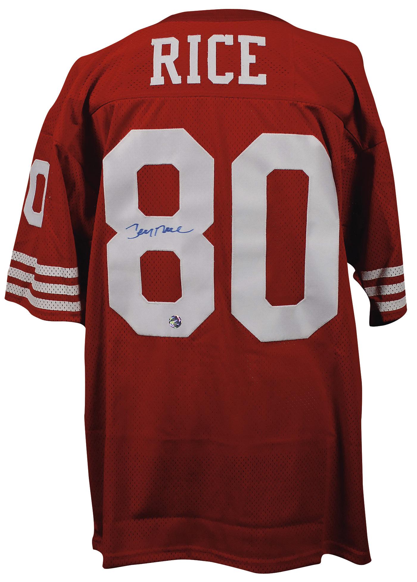 Replica San Francisco 49ers football jersey, with sewn on letters and numbers, signed in blue felt tip on the number on the back. In fine condition. Pre-certified Steve Grad/PSA/DNA and RRAuction COA.
