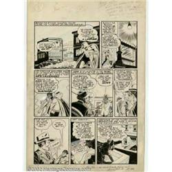 Jerry Robinson - Original Art for Batman #13 (DC, 1942). In the 1940s, if you picked up a Batman title, you were looking at Jerry Robinson's rendition of Bruce Wayne's alter-ego. Jerry became synonymous with Batman during this era. In this beautifully depicted page, we see Batman in three panels carrying a Robin dummy and searching for the bad guys. No earlier interior page has ever been offered for sale from this title, which makes it a highly sought-after original. On the top margin there is a note from the DC editor to Robinson telling him to "make this dummy in all appearances look like Robin..." The art, which measures approximately 13" x 18", is in very good condition with some blue-pencil work, minor white-out and a little wear, and is signed by Robinson.  Important notice: We expect to be auctioning lots at the rate of 200-250 per hour. Sometimes eBay Premier live bid software cannot keep up with that pace, so we strongly recommend that you place a realistic proxy bid now as insurance to avoid disappointment. Also please note that all Heritage/CAA lots purchased through eBay Premier carry a 20% Buyer's Premium.