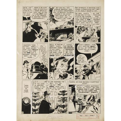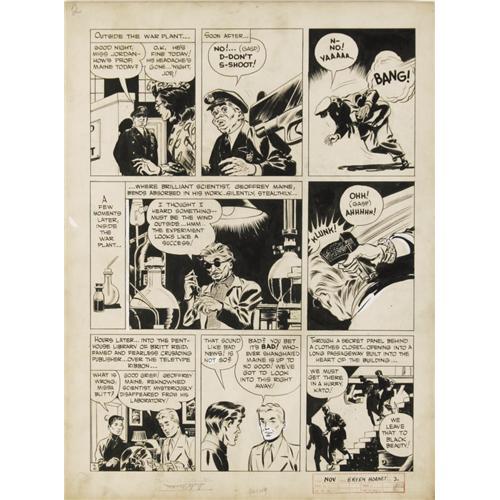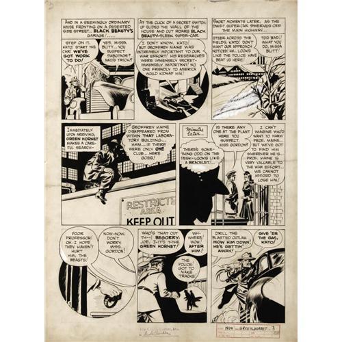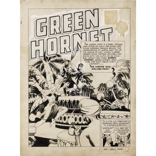 <B>Jerry Robinson and George Roussos - Green Hornet #21 Complete 10-page Story "The Corpse Who Walked Away" Original Art (Harvey, 1944).</B></I> Golden Age great and Batman ghost, Jerry Robinson, brought his own brand of storytelling excitement to the <B>Green Hornet</B></I> title with this corking 10-pager! This art was drawn on illustration boards, and the image area of each page measures 12.5" x 18". There are numerous touches of white-out used to correct the art and some aging to the boards; otherwise, the pages average Good condition. <BR><BR><B>Important notice:</B> Heritage usually auctions material at the rate of 200-250 lots per hour. On some occasions eBay Live bid software or the Internet may not be able to keep up with the pace of the auction. We recommend placing a realistic absentee bid now as insurance to avoid disappointment. Occasionally the auctioneer may eliminate or reject an eBay Live bid, and the auctioneer may also reopen a lot after the close of the eBay live bidding (usually because we missed an audience bid), and may reject your bid even if it shows you as the winning bidder. By bidding via eBay Live, you agree that Heritage may award the lot to another bidder at its sole discretion under the circumstances described above or any other reasonable circumstances. Since eBay bids are not shown to us until we open the lot on the floor, we treat those bids just like floor bids. In most cases the floor responds before the eBay bid is presented to us, due to Internet lag time, so for consistency we have made it a policy that floor bids are always considered first over tie eBay live bids. Also please note that all Heritage lots purchased through eBay Live carry a 22.5% Buyer's Premium. Please make sure you read the Terms and Conditions before you bid. This lot is being auctioned in conjunction with a live floor auction by Heritage Auction Galleries. All final auction and invoice information will be supplied by Heritage Auction Galleries, and all other information should be considered preliminary. Lot:41001 <BR><BR><B>Winning Notification and Billing:</B> After the FINAL session in this auction is complete, Heritage will send e-mail and snail mail invoices. This process normally takes several days. All final auction and invoice information will be supplied by Heritage Auction Galleries, and all other information should be considered preliminary. <BR><BR>This auction will be conducted on a live auction floor and over the Internet through eBay Live. If you choose to place an absentee bid, please take a moment to <font color='#0000ff'><u><a href='http://pages.ebay.com/liveauctions/help/before/laabsentee.html'>learn how eBay Live absentee bidding works</a></u></font><font color='#000000'>
