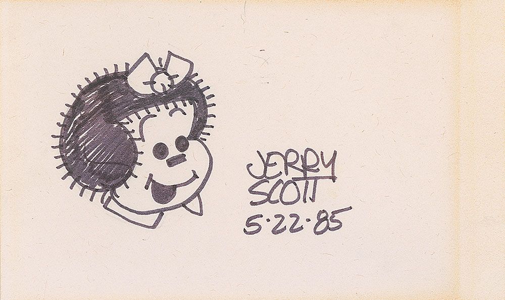 Original signed felt tip sketch of Nancy on an off-white 5 x 3 card, signed “Jerry Scott, 5-22-85.” In fine condition, with toning to borders.