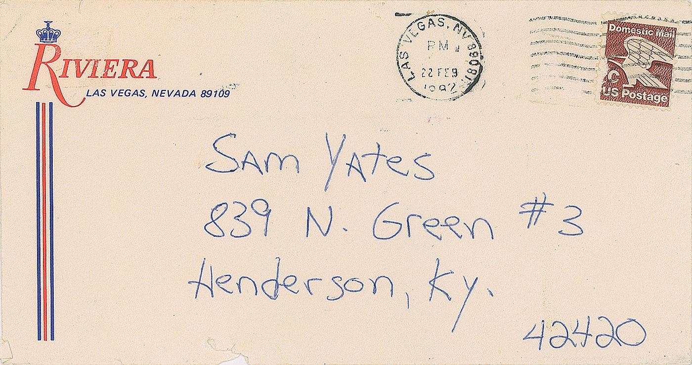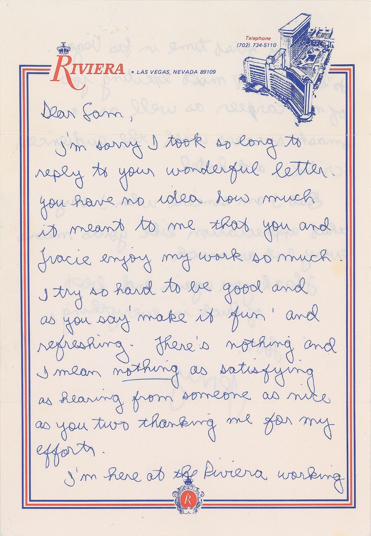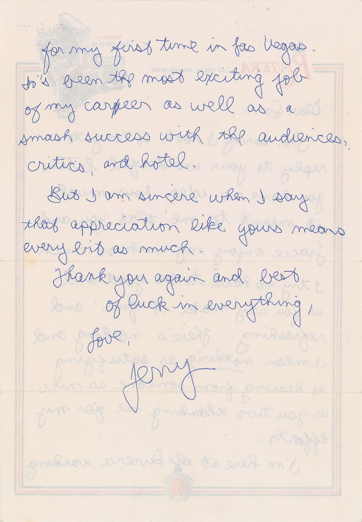 Early ALS signed “Jerry,” one page both sides, 7.25 x 10.5, Riviera letterhead, postmarked February 22, 1982. Letter to Sam Yates, in full: "I'm sorry I took so long to reply to your wonderful letter. You have no idea how much it meant to me that you and Gracie enjoy my work so much. I try so hard to be good and as you say 'make it fun' and refreshing. There's nothing and I mean nothing as satisfying as hearing from someone as nice as you two thanking me for my efforts. I'm here at the Riviera working for my first time in Las Vegas. It's been the most exciting job of my career as well as a smash success with the audiences, critics, and hotel. But I am sincere when I say that appreciation like yours means every bit as much. Thank you again and best of luck in everything." In fine condition. Accompanied by the original mailing envelope addressed in his own hand, with Seinfeld adding his mailing address and autograph on the reverse: "Jerry Seinfeld, 909 Westbourne #205, LA CA 90069." In early 1982, Canadian singer Anne Murray gave Seinfeld an opening spot for her 13-day run at the Riviera's Versailles Theater after watching him on The Tonight Show with Johnny Carson. Seinfeld later stated that he owes his success to Murray for those early Vegas shows.