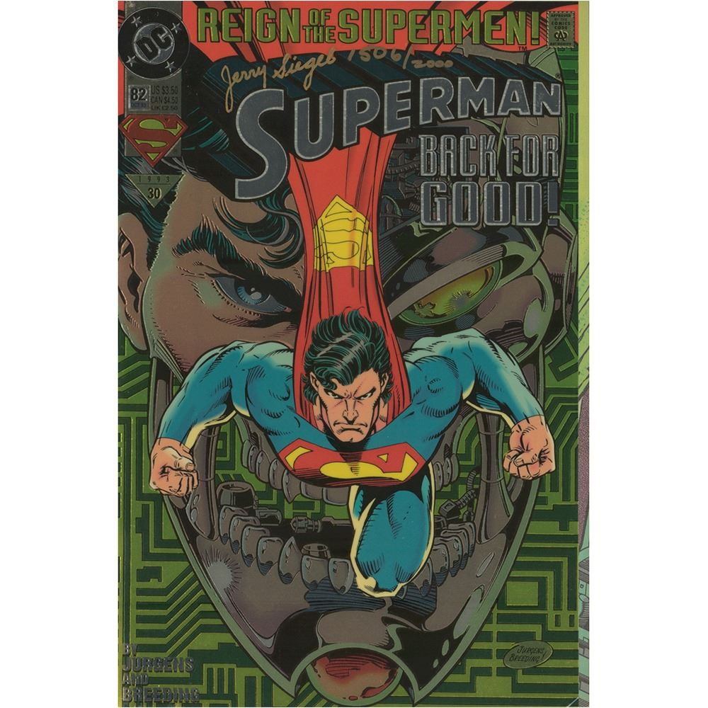 Limited edition of Superman #82 from October 1993 with a special foil cover, numbered 1506/2000, 6.75 x 10, 30 pages, signed on the front cover in gold ink by Superman co-creator Jerry Siegel. In very fine condition. Accompanied by a certificate of authenticity from Dynamic Forces, Inc.