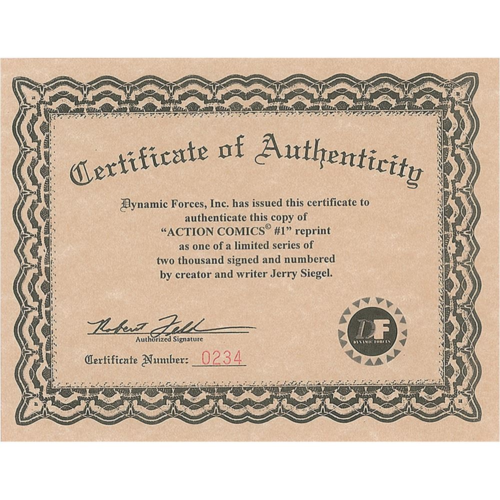 Limited edition reprint of the iconic Action Comics No. 1 comic book that introduced Superman into popular culture, numbered 234/2000, 6.75 x 10.25, signed on the front cover in black felt tip by creator and writer Jerry Siegel. In fine condition. Accompanied by a certificate of authenticity from the publisher, Dynamic Force, Inc.