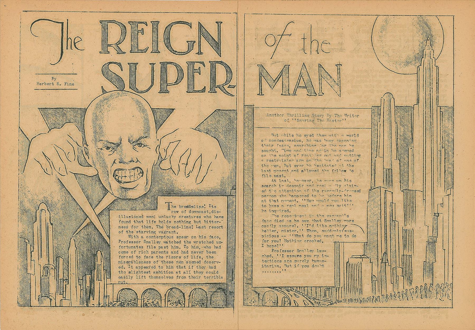 Originally written by Siegel in 1932, The Reign of the Superman told the story of a vagrant named Bill Dunn who, in exchange for ‘a real meal and a new suit,’ participates in an experiment that grants him telepathic powers. Intoxicated with his newfound abilities, Dunn seeks to take over the world, killing the chemist who created the formula. The story ends with his temporary powers worn away, and Dunn realizing that he will soon be forced to return to the bread line a forgotten man.