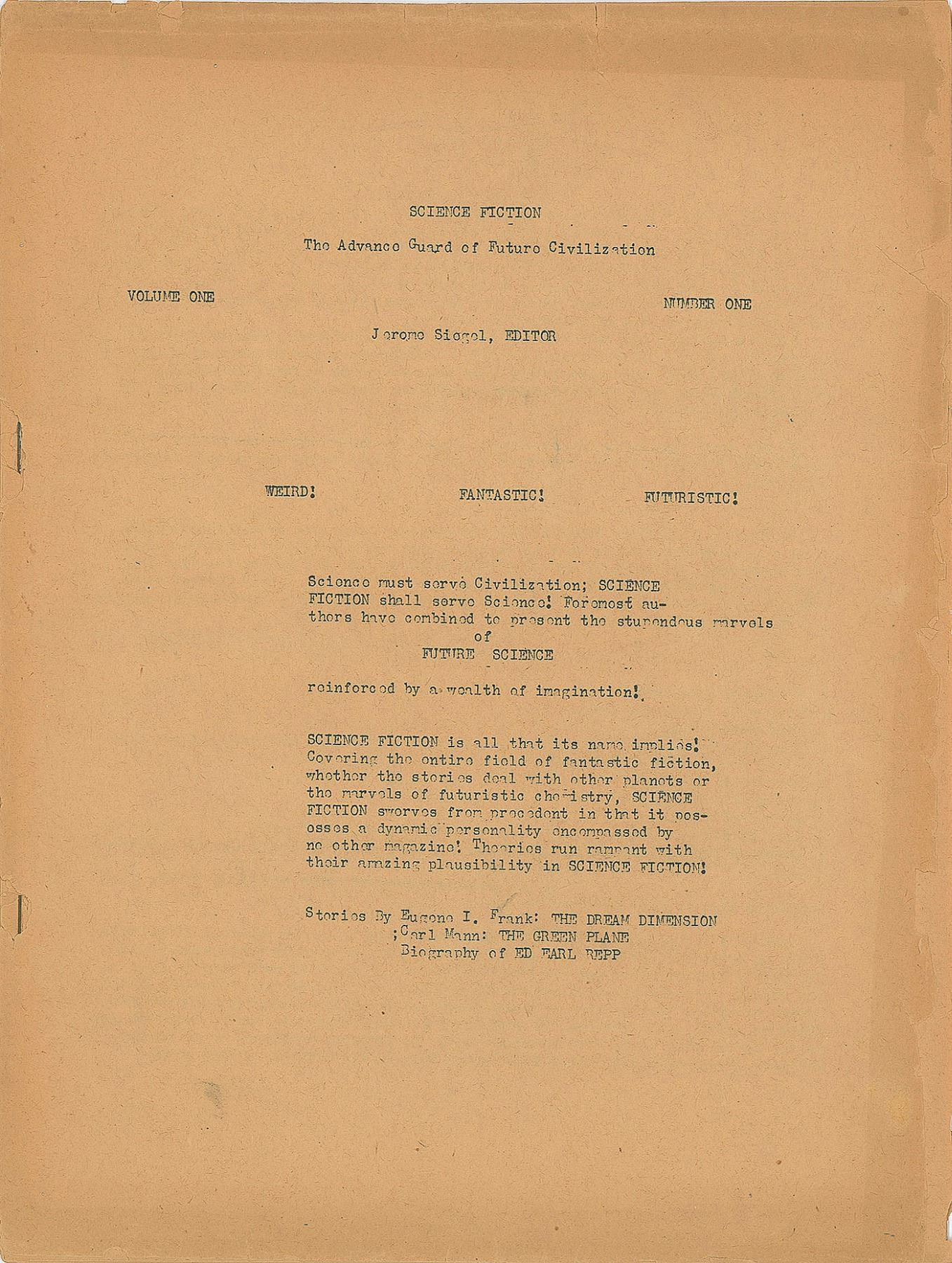 Issue No. 3 consists of 22 pages, 8.5 x 11, stapled, with missing front cover, the last two pages detached, and page 19 printed upside-down. The contents of the issue: The Reign of the Superman by Herbert S. Fine (pgs. 4-14, with tremendous illustrations by Shuster); About Amelia Reynolds Long by by legendary future sci-fi writer and agent Forrest J. Ackerman (pg. 14); The Dream Dimension [Part 3 of 3] by Eugene I. Frank (pgs. 15-18); and Science Fiction News, with last page listing books sold at the Smith Book Company in Lawrence, Massachusetts (pgs. 18-19). The opening contents page lists “Jerome Siegel” as editor and “Joe Shuster” as art editor and illustrator.