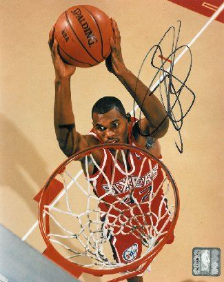 In his first season with the 76ers, Jerry Stackhouse led his team with a 19.2 points per game average, and was named to the NBA's All-Rookie team. In the 1996–97 season, the 76ers also drafted Allen Iverson. Combined, the two posted 44.2 points per game for the Sixers. Jerry Stackhouse has hand signed this Philadelphia 76ers 8x10 Photo. Certificate of Authenticity from Athlon Sports. Photo has slight ding/discolored/scuff, sold as is, no returns.