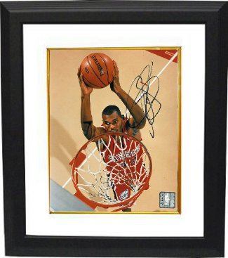 In his first season with the 76ers, Jerry Stackhouse led his team with a 19.2 points per game average, and was named to the NBA's All-Rookie team. In the 1996–97 season, the 76ers also drafted Allen Iverson. Combined, the two posted 44.2 points per game for the Sixers. Jerry Stackhouse has hand signed this Philadelphia 76ers 8x10 Photo dunking. Certificate of Authenticity from Athlon Sports. Custom White Mat and Premium Black Frame as shown.