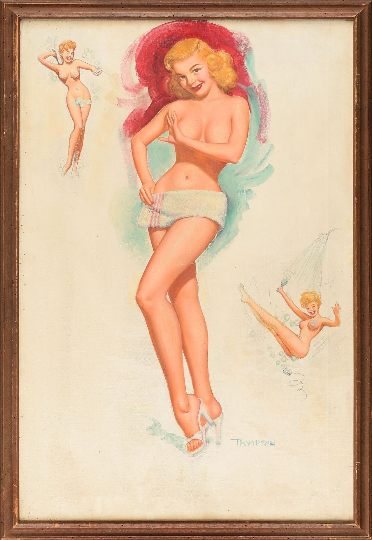 Popular American pin-up artist, known as T. N. Thompson, who created some of the most enduring calendar imagery of the 1950s. Original pin-up calendar oil painting entitled 'Ready to Throw in the Towel,' depicting a nude woman bathing and covering up with a tiny towel, accomplished by Jerry T. N. Thompson in oil on 19.75 x 29.75 stretched canvas, signed in the lower right in blue paint, "Thompson." This artwork was used for the November image of Thompson's 1955 'Studio Sketches' pin-up calendar. Framed and in fine condition.