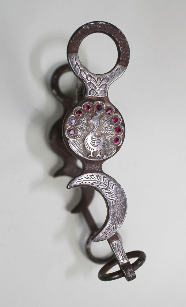 Attractive grazing bit in a large jeweled peacock pattern. Matching the spurs in the previous lot.