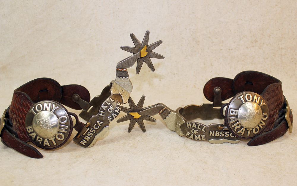 Amazing pair of oversized gal leg spurs with scalloped heelbands, and large eight point rowels. Custom made for Tony to commemorate his being in the Hall of Fame of the National Bit and Spur Association. Decorated by silver mounted basketstamped straps.
