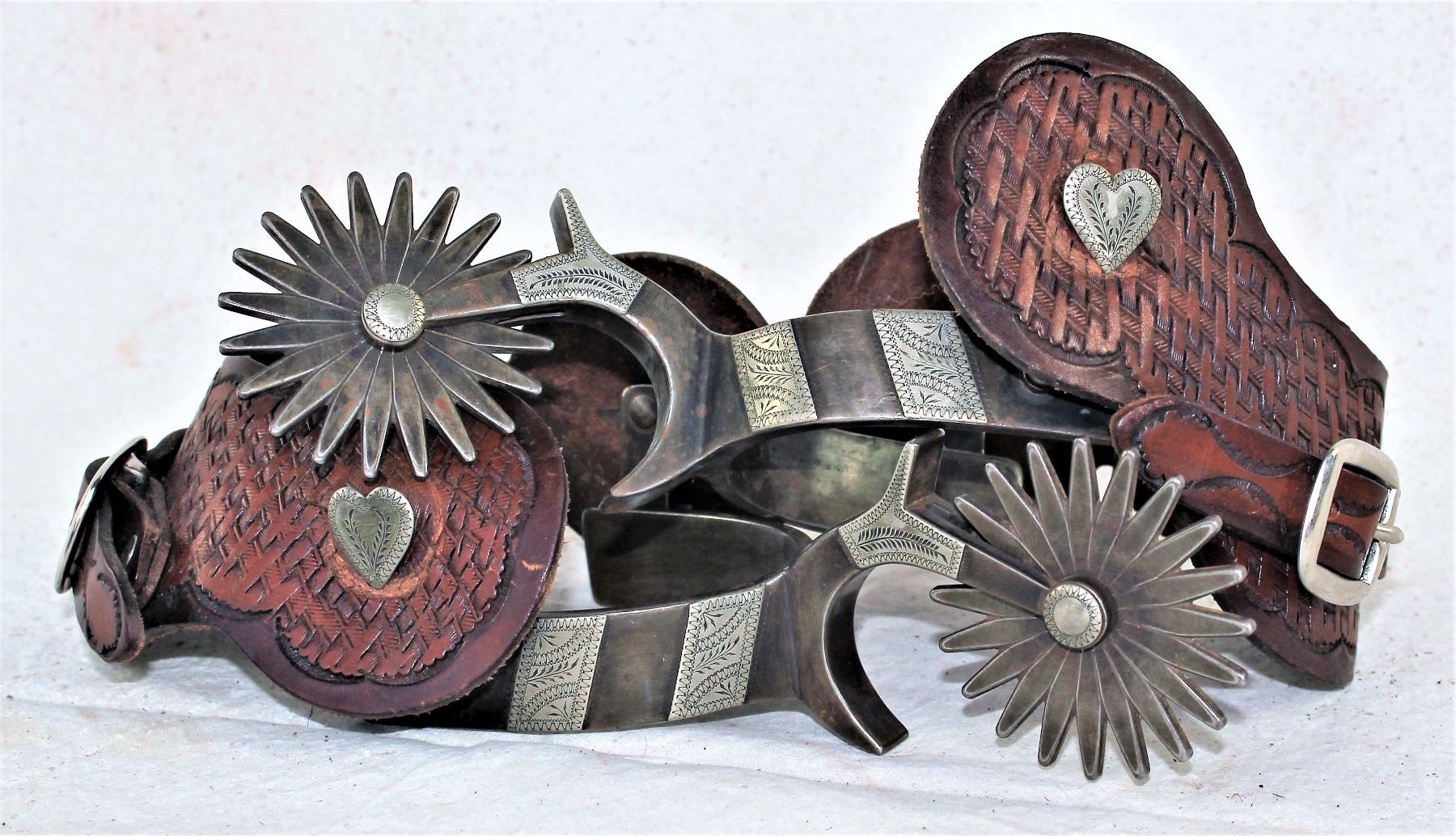 Massive Kelly Bro's pattern #90 fish hook spurs with radical chap guards and oversized multi-point rowels.