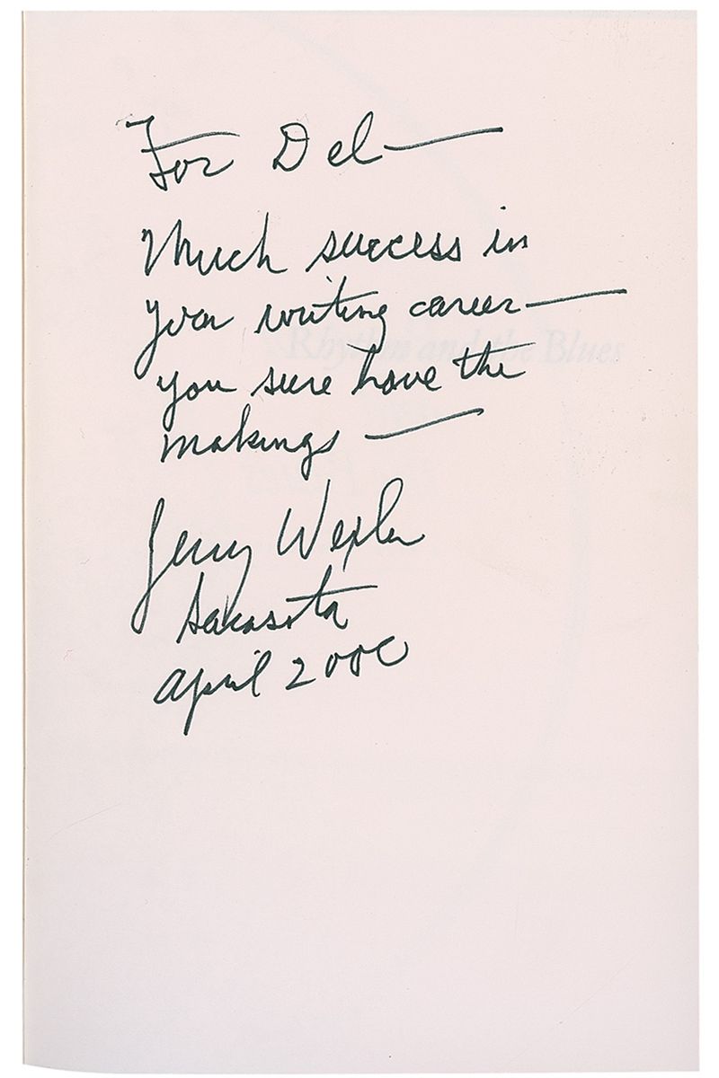 Prolific music producer at Atlantic Records and member of the Rock and Roll Hall of Fame (1917–2008) who partnered with Ahmet Ertegun to produce such greats as Ray Charles and Aretha Franklin and coined the term ‘rhythm and blues.’ Signed book: Rhythm and the Blues. First edition. NY: Alfred A. Knopf, 1993. Hardcover with dustjacket, 6.5 x 9.5, 331 pages. Signed and inscribed on the second free end page, “For Del—Much success in your writing career—you sure have the makings—Jerry Wexler, Sarasota, April 2000.” In fine condition