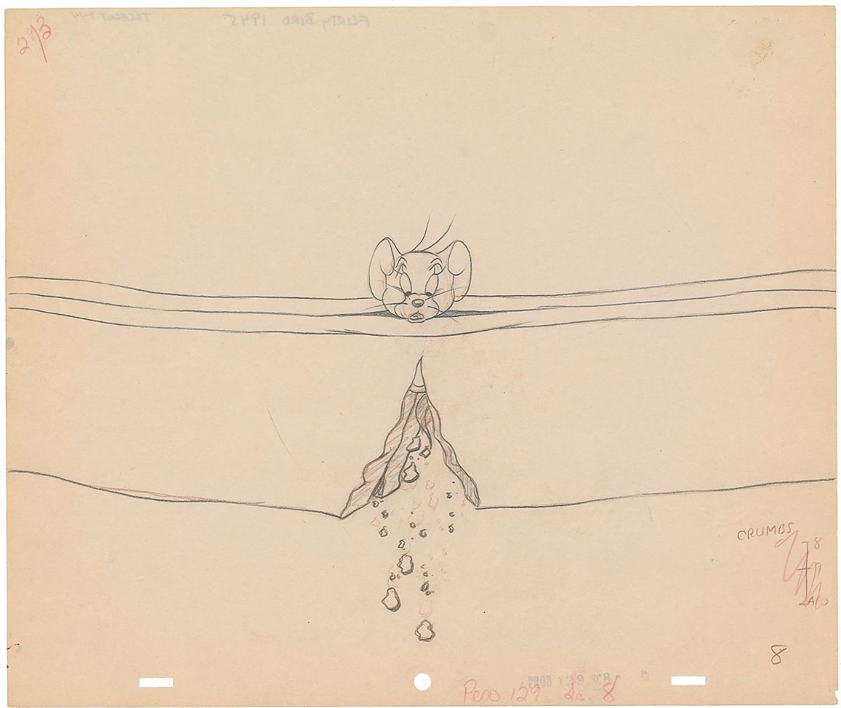 (MGM Studios, 1945) Original production drawing featuring Jerry from the Tom and Jerry cartoon Flirty Birdy, showing the beloved mouse stuck in a sandwich. Accomplished in graphite on untrimmed 12.5 x 10.5 animation paper. Character image measures 2 x 1, with a total image size of 12.5 x 6. In fine condition, with a couple trivial edge chips.