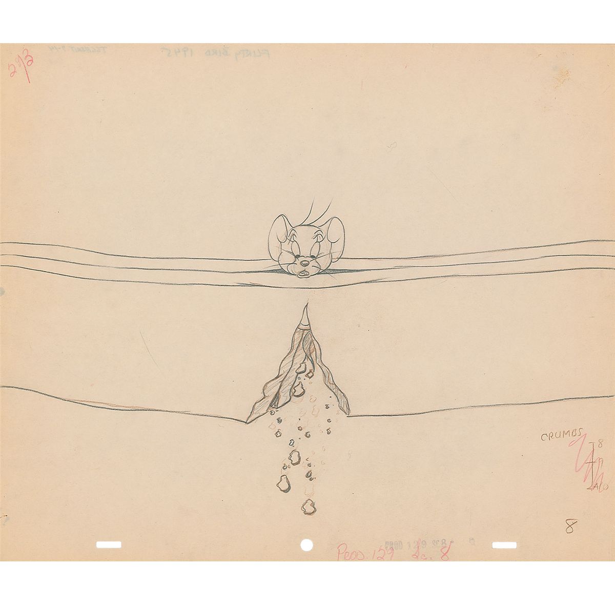 (MGM Studios, 1945) Two original production drawings featuring Jerry from Tom and Jerry, from the same scene of the ‘Jerry Sandwich’ from ‘Flirty Birdy.’ Accomplished in graphite on separate untrimmed 12.5 x 10.5 sheets of animation paper. Images measure 12.5 x 4.5. In fine condition.